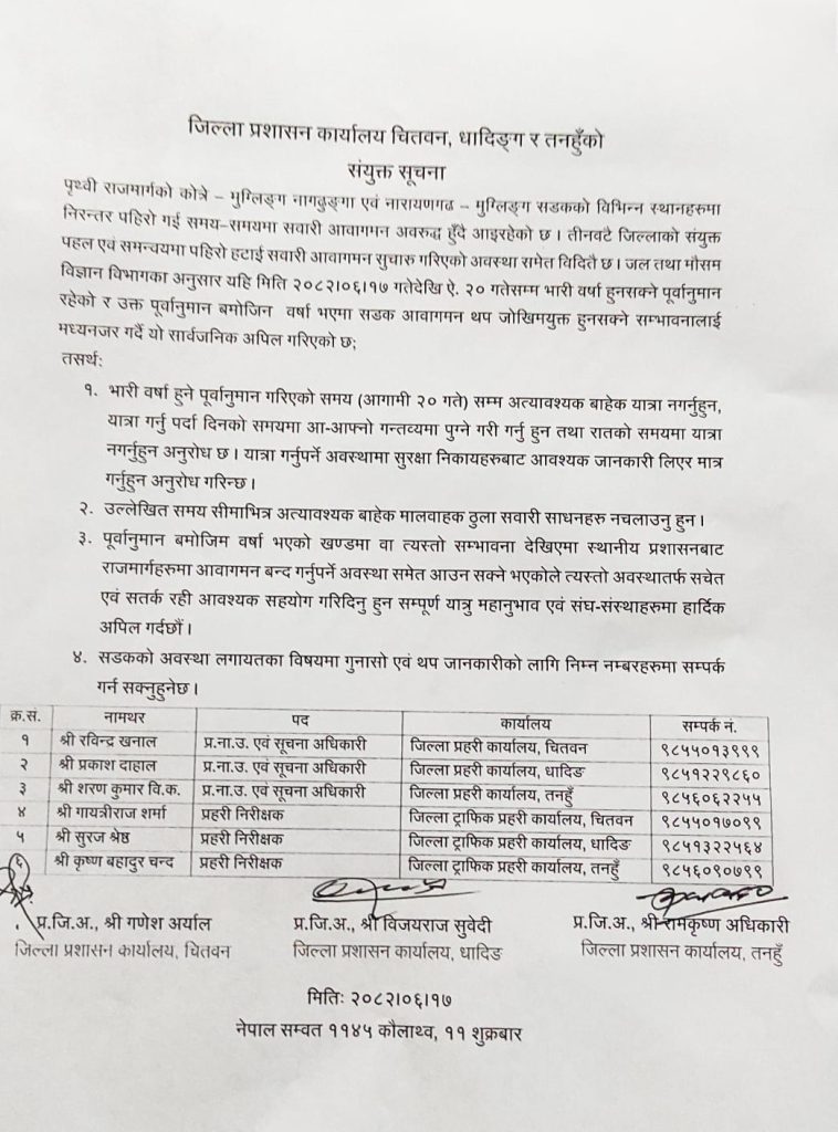 डुम्रे (तनहुँ) पृथ्वी राजमार्गको कोत्रे–मुग्लिन–नागढुङ्गा र मुग्लिन–नारायणगढ सडकमार्फत यात्रा गर्दा सचेतता अपनाउन तनहुँ, चितवन र धादिङका जिल्ला प्रशासन कार्यालयले संयुक्त सूचना जारी गरेका छन् । जल तथा मौसम विज्ञान विभागका अनुसार आजदेखि यही असोज २० गतेसम्म भारी वर्षा हुनसक्ने पूर्वानुमान गरेकाले संयमित भएर यात्रा गर्न ती कार्यालयले संयुक्त रुपमा अनुरोध गरेका हुन् ।