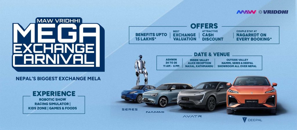 काठमाडौँ । अटोमोबाइल समूह एमएडब्लु वृद्धिले आगामी शुक्रबार (असोज २४) देखि काठमाडौं गैरीधारास्थित एलिस रिसेप्सन र देशभरका दिपल, नामी र सेरेसका अधिकृत सोरुमहरुमा चाडपर्व लक्षित मेगा एक्सचेन्ज कार्निभलको आयोजना गर्ने भएको छ ।
