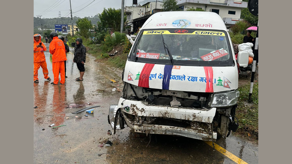 चितवनबाट लमजुङतर्फ जाँदै गरेको बाप्र ०३–००१ ज ०९३७ नम्बरको विद्युतीय माइक्रो चालकले नियन्त्रण गुमाई सडकछेउको भित्तामा ठोक्किँदा माइक्रोमा सवार १४ जना घाइते भएका जिल्ला प्रहरी कार्यालय तनहुँले जनाएको छ । त्यसक्रममा उक्त माइक्रो सडक छेउमा रोकिराखेको नेपाल विद्युत् प्राधिकरणको बा१ञ १२८७ नम्बरको गाडीसँग समेत ठोक्किएको थियो ।