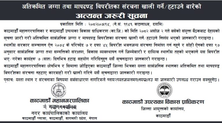 काठमाडौं । काठमाडौं महानगरपालिकाले सात दिनभित्र अतिक्रमित जग्गा तथा मापदण्ड विपरीतका संरचना खाली गर्न अनुरोध गरेको छ। एक सूचना सार्वजनिक गर्दै असोज २ गतेको काठमाडौं महानगरपालिका र काठमाडौं उपत्यका प्राधिकरणको निर्णय अनुसार सात दिनभित्र अतिक्रमित जग्गा र मापदण्ड विपरीतका संरचना खाली गर्न अनुरोध गरिएको छ।