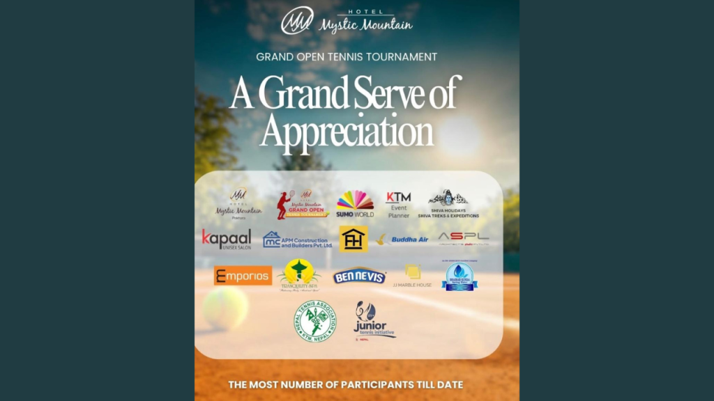 काठमाडौं। होटल मिस्टिक माउन्टेनको आयोजनामा होटल मिस्टिक माउन्टेन ग्रान्ड ओपन टेनिस प्रतियोगिताको तयारी पूरा भएको आयोजकले जनाएको छ । प्रतियोगिता मंगलबारदेखि सातदोबाटोस्थित टेनिस कम्प्लेक्समा हुँदैछ ।