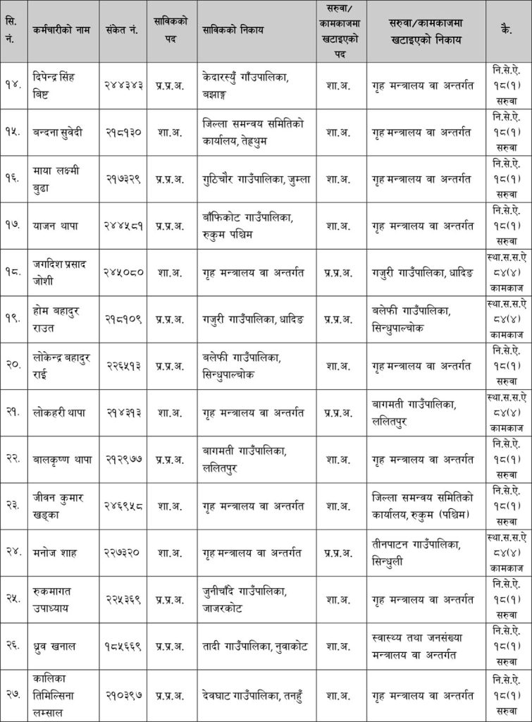 संघीय मामिला तथा सामान्य प्रशासन मन्त्रालयले यही कात्तिक २५ गतेको सचिवस्तरीय निर्णयबाट कर्मचारीहरुको सरुवा गरेको हो ।
