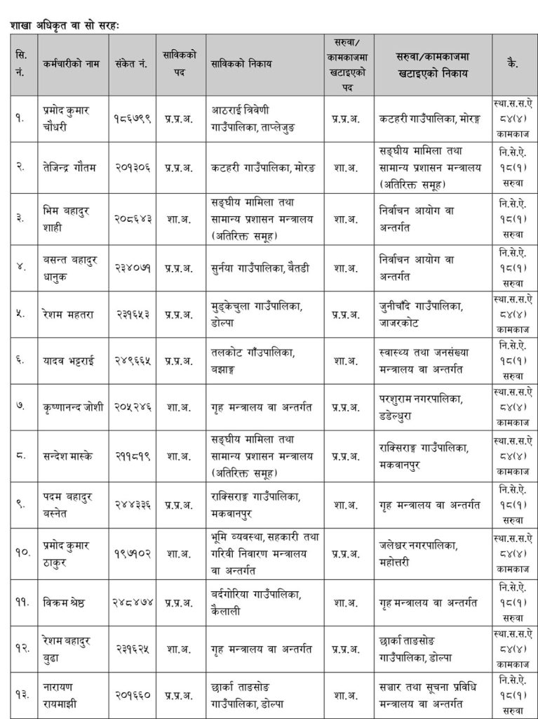 सरुवा हुने उपसचिवहरुमा भिमकान्त पौडेल, विवेक घिमिरे, खेमराज खत्री, रोमबहादुर महत, पुनाराम पौडेल, विनय कुमार श्रीवास्तव छन् । यसैगरी डिकबहादुर कार्की, सुरेन्द्र प्रधान, अमर बहादुर ओली, दिनेशराज पन्त, मुकुन्द शर्मा र डिल्लीराज श्रेष्ठको नाम पनि सरुवा भएका उपसचिवहरुको सूचीमा छन् ।