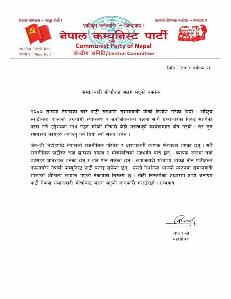समाजवादी मोर्चा छाड्यो विप्लव नेतृत्वको नेकपाले