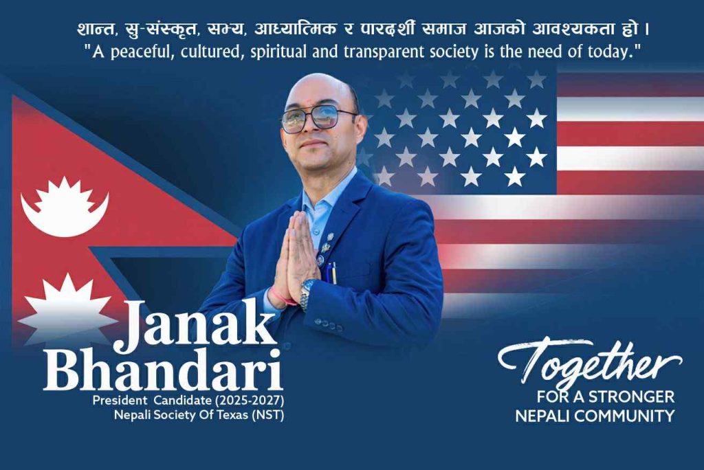 टेक्सास(अमेरिका)। नेपालीमुलका बासिन्दाहरुको बाहुल्यता रहेको अमेरिकास्थित टेक्सास राज्यका स्थापना भएको नेपालीहरुको सबै भन्दा ठुलो संस्था नेपाल समाज टेक्सास(एनएसटी)को अध्यक्ष पदका लागि सामाजिक अभियन्तता जनक भण्डारीले उमेदवारी घोषणा गरेका छन ।