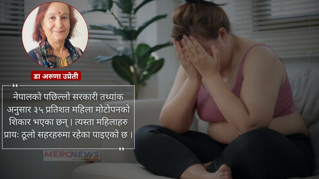 नेपाली महिलाहरुको अहिले सरदर आयु ७२ वर्ष रहेको सरकारको पछिल्लो तथ्याङ्कले देखाएको छ । नेपाली महिलाको सरदर आयु यति वर्ष हुनु जनस्वास्थको दृष्टिकोणले सफलता मान्न सकिन्छ । तर अर्कोतिर उनीहरु अस्वस्थ पनि बन्दैछन् । पछिल्लो सरकारी तथ्याङ्कले के देखाउँछ भने ३५ प्रतिशत नेपाली महिला मोटोपनको शिकार भएका छन् । त्यस्ता महिलाहरु प्रायः नेपालका ठूलो सहरहरुमा रहेका छन् । खासगरी धनी परिवारका ५३ प्रतिशत र गरिब परिवारका २० प्रतिशत महिलामा यो समस्या देखिएको छ । गाउँघरका गरिब महिलाहरुको कार्यबोभ, धेरै रहे पनि अहिले पत्रु खाना धेरै खाने भएकाले उनीहरुमा पनि मोटोपनको समस्या देखिन थालेको छ ।