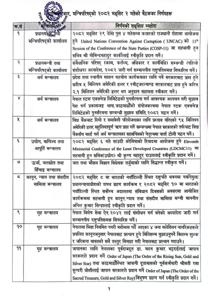 नेपाली सेनाका दुईजना महासेनानीहरूलाई सहायक रथी दर्जामा बढुवा गर्ने, ल्याण्ड फोर्स टकको छैटौं बैठक २०८२ मङ्सिर ३ देखि ५ गतेसम्म काठमाडौंमा आयोजना गर्न स्वीकृति दिने निर्णय गरेको छ ।