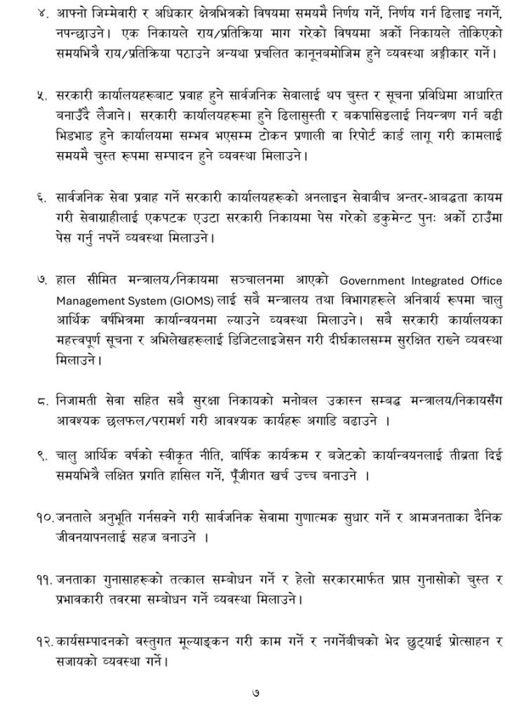 बुधबार मुख्यसचिवको पदबहालीपछि विभिन्न मन्त्रालयका सचिव तथा कर्मचारीहरूलाई सम्बोधन गर्दै उनले आफ्नो कार्यकालका २५ बुँदे प्राथमिकता सार्वजनिक गरेका हुन् ।