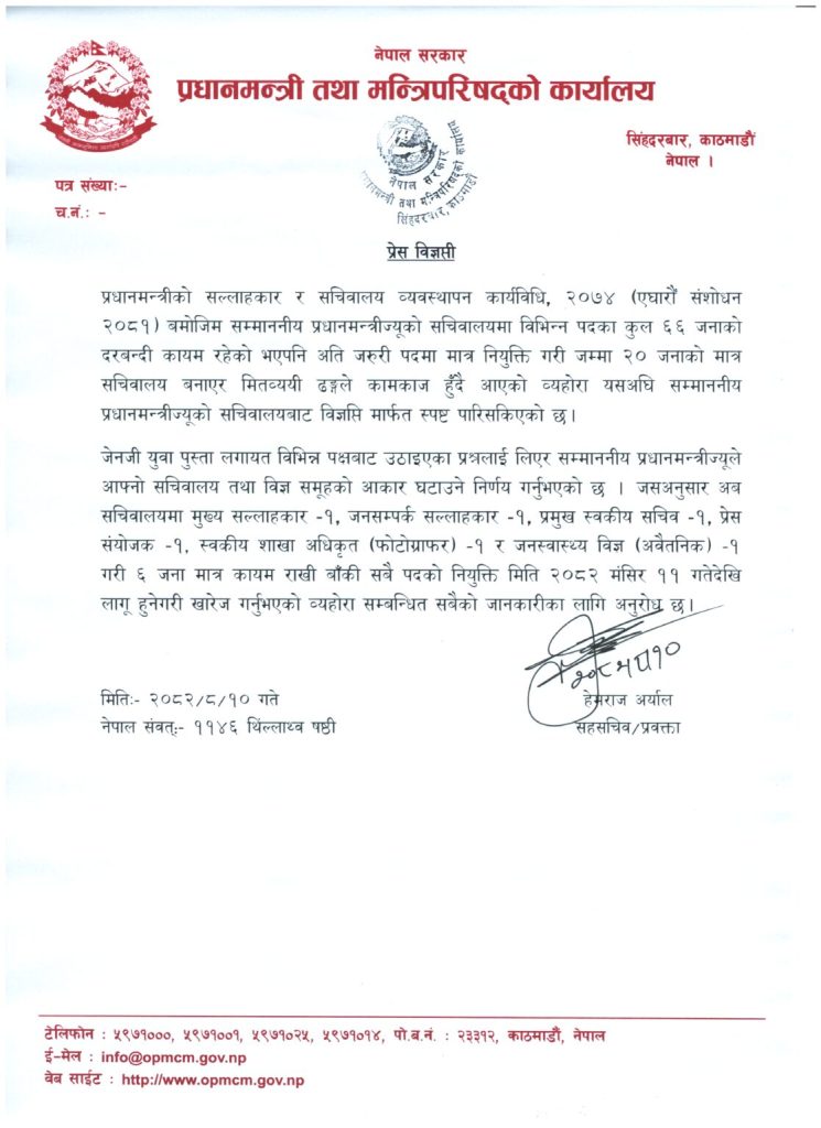 हाल २० जना रहेकोमा अब ६ सदस्यीय मात्र बनाउने गरी कटौतीको निर्णय भएको प्रधानमन्त्री तथा मन्त्रिपरिषद्को कार्यालयले जनाएको छ।अब प्रधानमन्त्रीको सचिवालयमा मुख्य सल्लाहकार, जनसम्पर्क सल्लाहकार, प्रमुख स्वकीय सचिव, प्रेस संयोजक, फोटोग्राफर र जनस्वास्थ्य विज्ञ मात्र रहने छन्। ६ जनाबाहेक बाँकी सबै पदको नियुक्ति मंसिर ११ गतेदेखि लागु हुनेगरी खारेज गरेको कार्यालयले जनाएको छ।