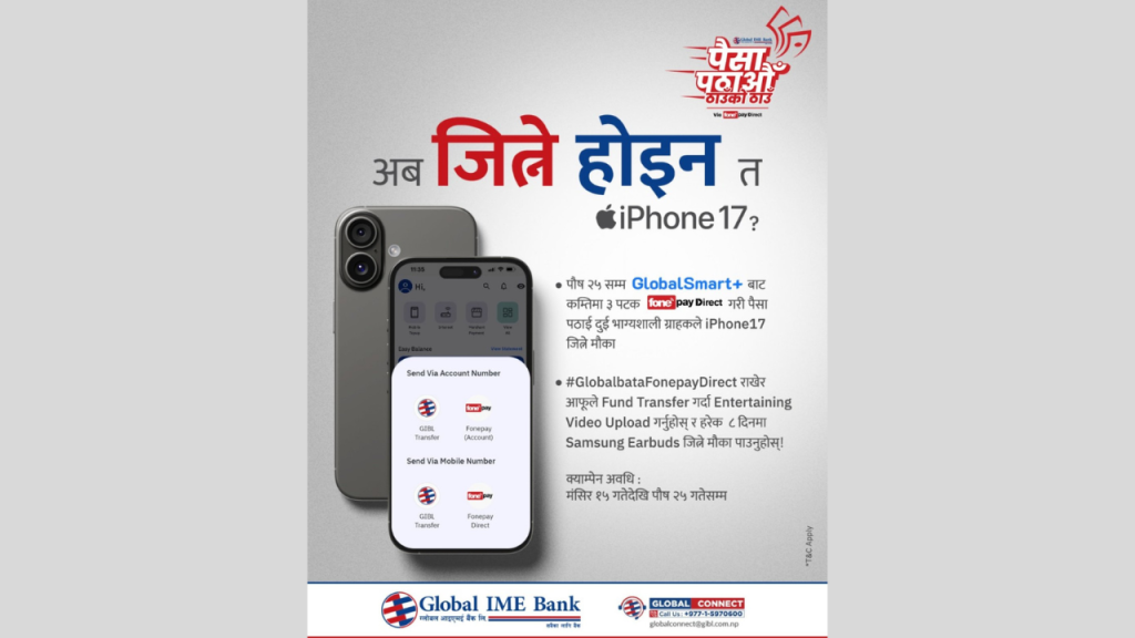 ग्लोबल आइएमई बैंकको मोबाइल बैंकिङ प्रयोगकर्तालाई आइफोन १७ जित्ने मौका