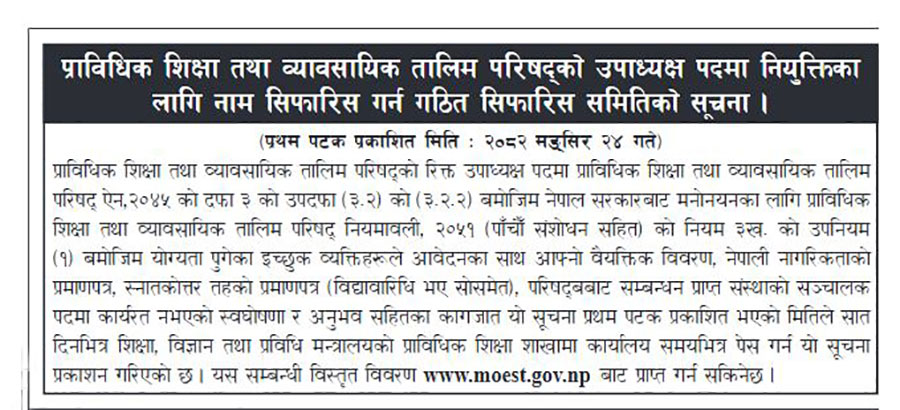 सूचनामा लेखिएअनुसार आजबाट सात दिनभित्र शिक्षा मन्त्रालयको प्राविधिक शिक्षा शाखामा दरखास्त बुझाउन भनिएको छ ।
