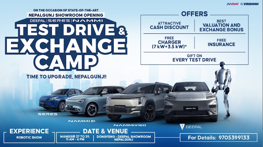 कार्यक्रममा हालै सम्पन्न नाडा अटो शोमा धेरै चर्चा भएको दिपाल एस०५ र नामी भिगो जस्ता मोडेलहरूको पनि टेस्ट ड्राइभ गर्न सकिनेछ।