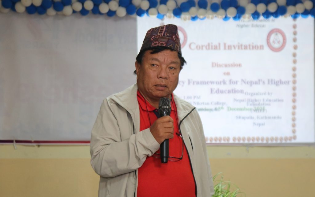 नेपाल उच्चशिक्षा प्रतिष्ठानका अध्यक्ष प्राध्यापक डा तीर्थराज खनियाले कार्यक्रमको उद्देश्य र सान्दर्भिकतामाथि प्रकाश पार्दै नेपालको उच्चशिक्षा प्रणालीलाई समयानुकूल सुधार गर्न नीतिगत स्पष्टता, संस्थागत स्वायत्तता र उत्तरदायी नेतृत्व अपरिहार्य रहेको बताए ।