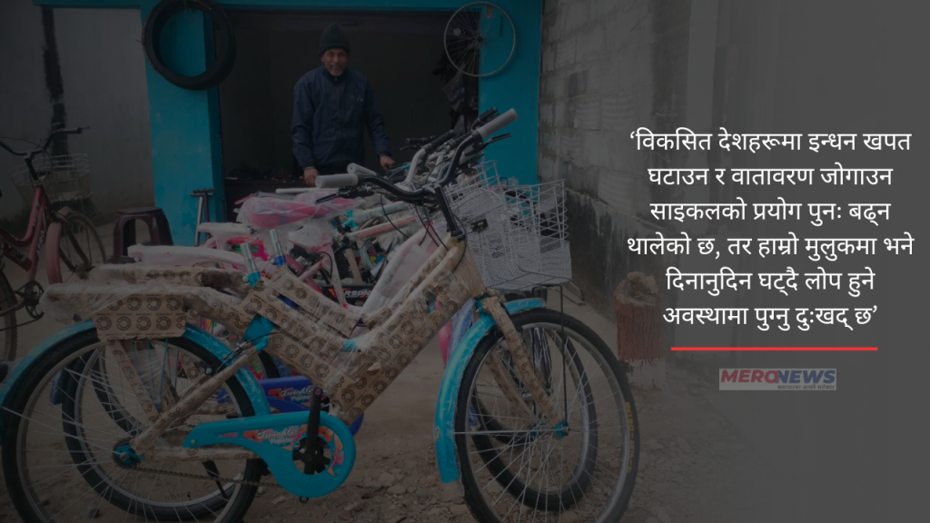 “अहिले विद्यालयहरूले घर–घरमै बसको व्यवस्था गरेका छन्, कृषि उपज सङ्कलनका लागि व्यापारीहरू आफैँ ढुवानीका साधन लिएर किसानको खेतबारीमै पुग्छन्, यसले गर्दा साइकलको उपयोगिता झनै घट्दै गएको छ”, उनले भने ।