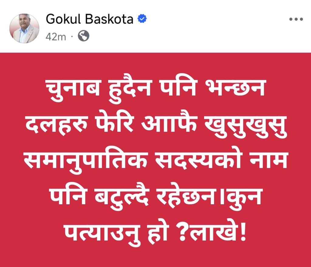 गोकुल बास्कोटाको कटाक्ष : चुनाव हुँदैन भन्देै दलहरु भित्रभित्रै समानुपातिक उमेदवार नाम बटुल्दैछन्