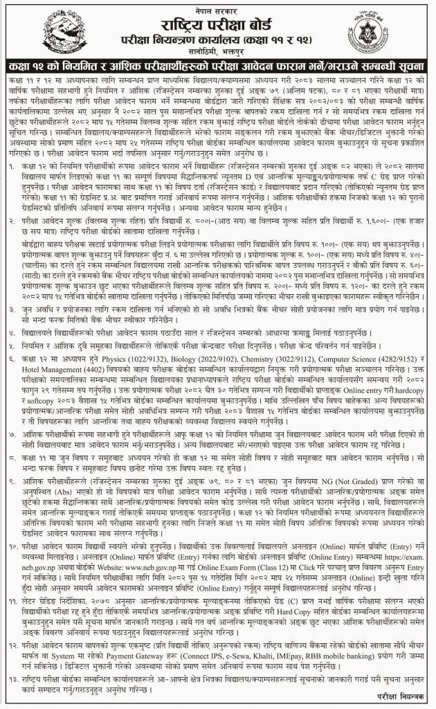 ०८३ को वार्षिक परीक्षाका लागि नियमित र आंशिकतर्फ (रजिस्ट्रेसन नम्बरका सुरुका दुई अंक ७९(अन्तिमपटक), ८० र ८१ भएका परीक्षार्थी मात्र)का विद्यार्थीका लागि फाराम खुलाइएको हो ।