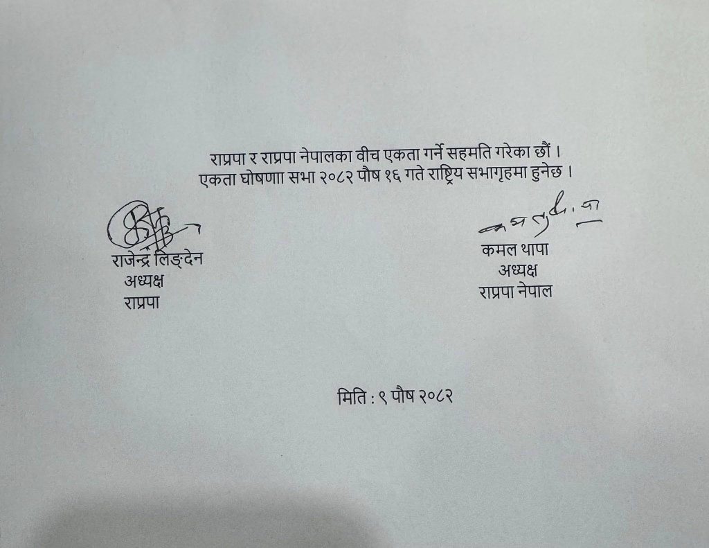 दुई नेताबीचको बुधबारको छलफलले एकताको विषय टुंगो लगाएको थियो । राप्रपा, नेपालका अध्यक्ष कमल थापाले राष्ट्रिय प्रजातन्त्र पार्टीका अध्यक्ष राजेन्द्र लिङदेनसँगको फोटो सामाजिक सञ्जालमा राख्दै पार्टी एकताको निर्णय भएको जानकारी गराएका हुन्।