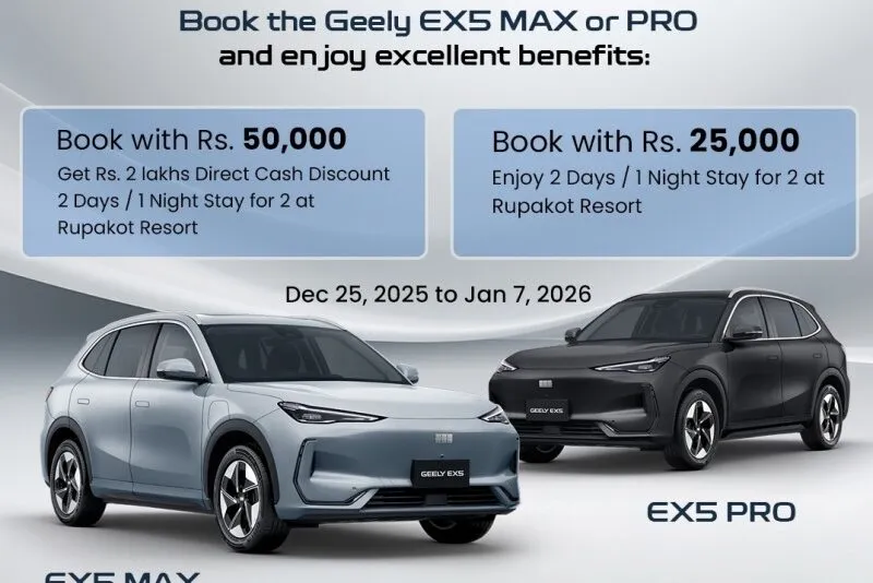 यस विशेष योजनाअन्तर्गत डिसेम्बर २५, २०२५ देखि जनवरी ७, २०२६ को अवधिमा जिली ईएक्स फाइभ म्याक्स र प्रो बुकिङ गर्ने ग्राहकले विशेष लाभहरू प्राप्त गर्न सक्नेछन् ।