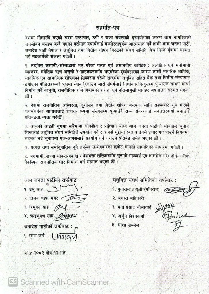 देशमा मौलाउँदै गएको चरम भ्रष्टाचार, ठगी र राज्य संयन्त्रको दुरुपयोगका कारण आम नागरिकको जनजीवन असह्य बन्दै गएको वर्तमान यथार्थलाई गम्भीरतापूर्वक आत्मसात गर्दै आजपा, जनादेश पार्टी र लघुबित्त तथा वित्तीय शोषण विरुद्धको संघर्ष समिति बिच सहकार्य गर्दै अगाडी बढने सहमती भएको सहमितपत्रमा उल्लेख छ ।