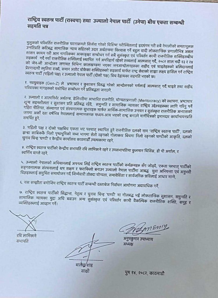 काठमाडौं – राष्ट्रिय स्वतन्त्र पार्टी (रास्वपा) र उज्यालो नेपाल पार्टी (उनेपा)बीच एकता गर्ने सहमति भएको छ। कमल पोखरीमा सोमबार साँझ कुलमान, रवि र काठमाडौं महानगरपालिकाका मेयर बालेन्द्र साहबीच भएको वार्तामा यो सहमति भएको हो ।सहमति अनुसार, एकतापछि बन्ने राजनीतिक दलको नाम ‘राष्ट्रिय स्वतन्त्र पार्टी’ नै रहनेछ। दलको झन्डा साबिककै निलो पृष्ठभूमिमा सेतो गोलाकारभित्र निलो घण्टी रहने, चुनाव चिन्ह ‘घण्टी’ र केन्द्रीय कार्यालय काठमाडौँ उपत्यकामा रहने सहमति भएको छ।राष्ट्रिय स्वतन्त्र पार्टीको केन्द्रीय सभापतिमा रवि लामिछाने रहनेछन्। उपसभापतिमा कुलमान घिसिङ, डीपी अर्याल र स्वर्णिम वाग्ले रहने व्यवस्था गरिएको सहमति पत्रमा उल्लेख गरिएको छ ।उज्यालो नेपाल पार्टीको अभियानलाई राष्ट्रिय स्वतन्त्र पार्टीका कार्यक्रमसँग जोड्दै एकता पश्चात् संगठनात्मक संरचनालाई थप सुदृढ बनाइने जनाइएको छ। उज्यालो नेपाल पार्टीमा आबद्ध युवा अभियन्ता तथा अनुभवी विज्ञहरूलाई योग्यता, समावेशिता र सार्वजनिक छविलाई आधार मानी जिम्मेवारी दिने सहमति गरिएको छ।
