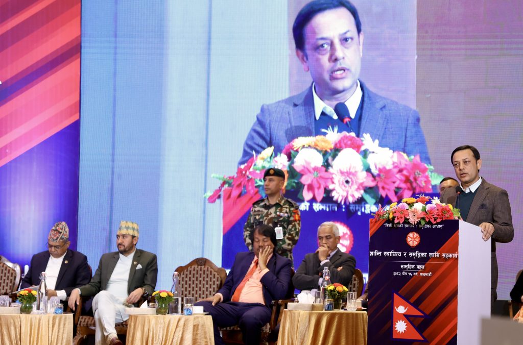 नेपाल उद्योग वाणिज्य महासङ्घद्वारा आज यहाँ आयोजित ‘शान्ति, स्थायित्व र समृद्धिका लागि सहकार्य—सामूहिक पहल’ कार्यक्रममा अर्यालले सबै क्षेत्रको सहकार्यबाटै शान्ति र समृद्धि सम्भव रहेको बताए ।