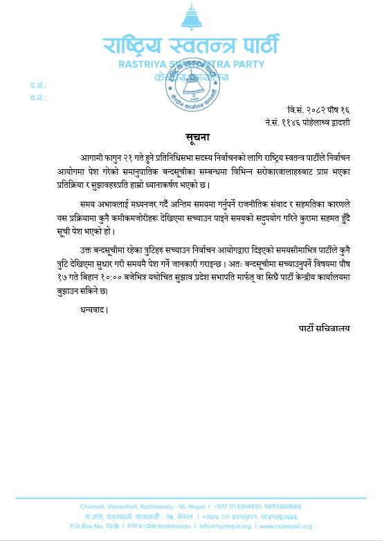 बन्दसूचीमा सच्याउनुपर्ने विषयमा पुस १७ गते बिहान १० बजेभित्र यथोचित सुझाव प्रदेश सभापति मार्फत वा सिधै पार्टी केन्द्रीय कार्यालयमा बुझाउन भनिएको छ ।