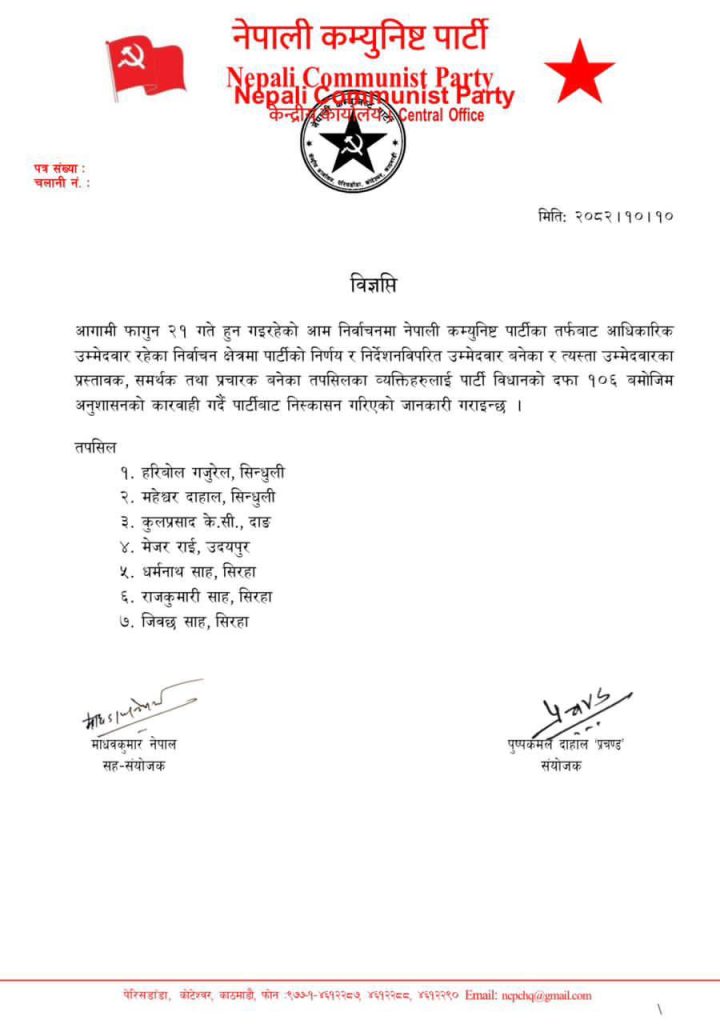 नेकपाका संयोजक प्रचण्ड र सहसंयोजक माधव नेपालको संयुक्त हस्ताक्षरमा शनिबार जारी विज्ञप्तिअनुसार ‘आगामी फागुन २१ गते हुन गइरहेको आम निर्वाचनमा नेपाली कम्युनिस्ट पार्टीका तर्फबाट आधिकारिक उम्मेदवार रहेका निर्वाचन क्षेत्रमा पार्टीको निर्णय र निर्देशनविपरीत उम्मेदवार बनेका र त्यस्ता उम्मेदवारका प्रस्तावक, समर्थक तथा प्रचारक बनेकाले विधानको दफा १०६ बमोजिम अनुशासनको कारबाही गर्दै पार्टीबाट निष्कासन गरिएको हो।’
