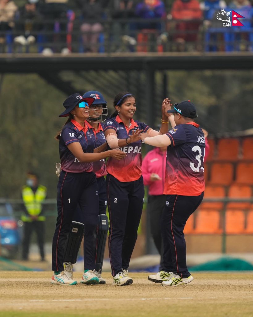 नेपालका लागि रिया शर्माले २ विकेट लिइन्। कविता कुवँर, पुजा महतो, सिता रानामगर र रुविना क्षेत्रीले समान एक विकेट आफ्नो नाममा गरे।
