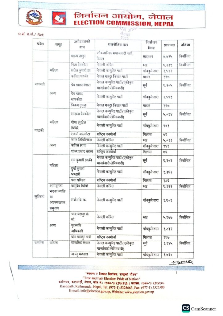 निर्वाचनमा गठबन्धनका सबै उमेदवार निर्वाचित भए । कांग्रेसले ९, एमालेले आठ र जनता समाजवादी पार्टी नेपालले एक सिट पाएको छ ।प्रत्येक प्रदेशमा भएको मतदानपछि निर्वाचन आयोगले सबै उमेदवारको मतपरिणाम सार्वजनिक गरेको छ ।
