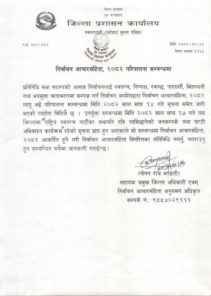 निर्वाचन आचारसंहिता २०८२ परिपालन सम्बन्धमा जारी गरिएको ध्यानाकर्षणपत्रका भनिएको छ, ‘उपर्युक्त सम्बन्धमा मिति २०८२ साल माघ २७ गते यस जिल्लामा ‘राष्ट्रिय स्वतन्त्र पार्टीका सभापति रवि लामिछानेको जनसम्पर्क तथा घण्टी अभिवादन कार्यक्रम’ रहेको सूचना प्राप्त हुन आएकाले सो सम्बन्धमा निर्वाचन आचारसंहिता, २०८२ आकर्षित हुनेगरी निर्वाचन आचारसंहिताविपरीतका गतिविधि नगर्नु, नगराउनु हुन सम्बन्धित सबैमा जानकारी गराइन्छ ।