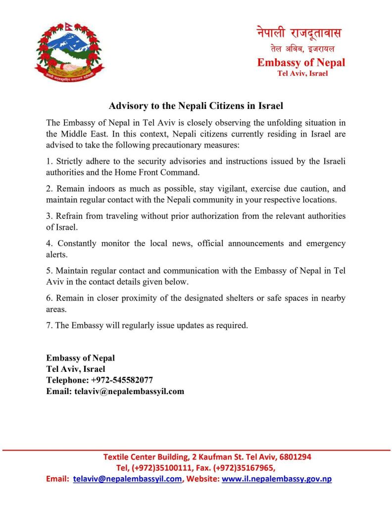 इजरायलस्थित नेपाली दूतावासले मध्यपूर्वमा विकसित परिस्थितिलाई नजिकबाट नियालिरहेको उल्लेख गर्दै भनेको छ, ‘यस सन्दर्भमा हाल इजरायलमा बसोबास गरिरहेका नेपाली नागरिकहरूलाई निम्न सावधानी अपनाउन सल्लाह दिइन्छ।’