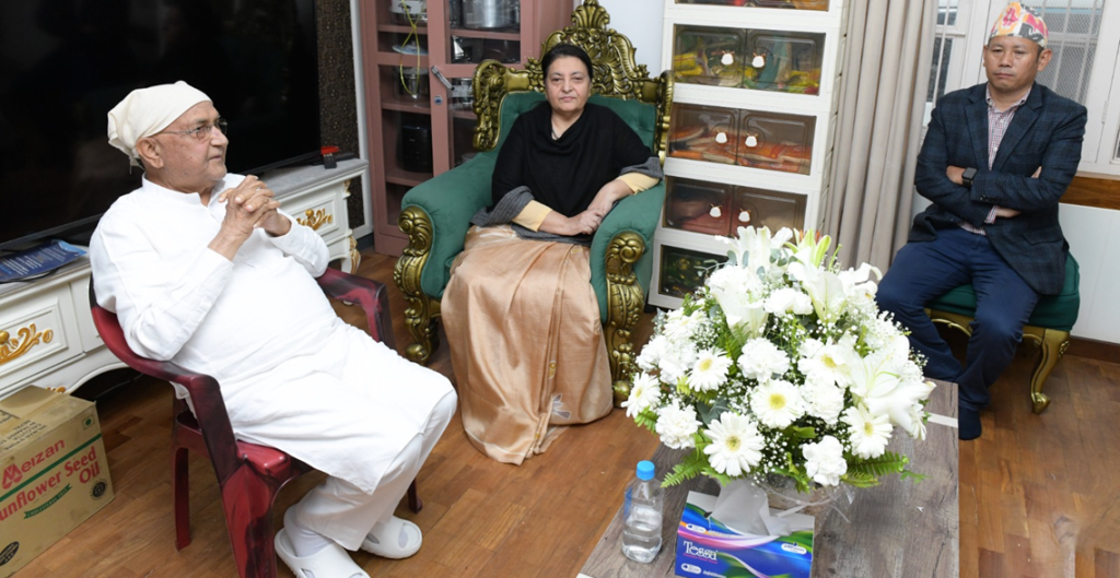 काठमाडौँ । पूर्वराष्ट्रपति विद्यादेवी भण्डारीले नेकपा (एमाले) का अध्यक्ष केपी शर्मा ओलीलाई भेटेर उहाँका पिता मोहनप्रसाद ओलीको निधनप्रति समवेदना दिएकी छन् ।