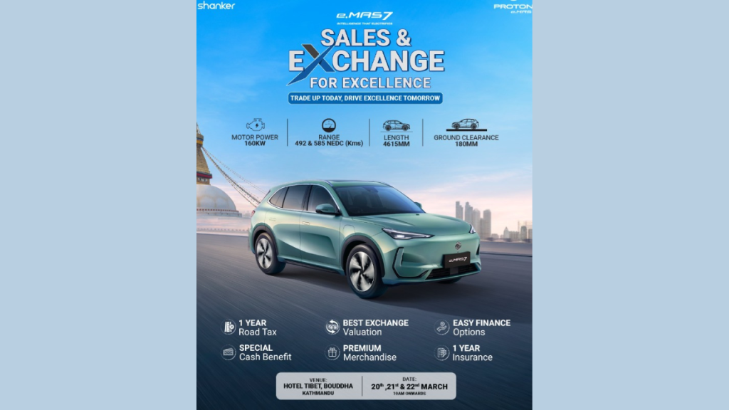 काठमाडौंको बौद्धस्थित होटल तिब्बतमा तीन दिन (चैत ६, ७ र ८ गते)सम्म ‘सेल्स एन्ड एक्सचेन्ज फर एक्सेलेन्स’ योजना सार्वजनिक गरेको हो । ‘ट्रेड अप टुडे, ड्राइभ एक्सेलेन्स टुमोरो’ भन्ने मूल नाराका साथ आयोजना हुन लागेको कार्यक्रममा ग्राहकहरूलाई जुनसुकै ब्रान्डका पुराना गाडी साट्दा बजारमा प्रचलित दरभन्दा उच्च मूल्यांकन प्रदान गर्ने कम्पनीले जनाएको छ ।