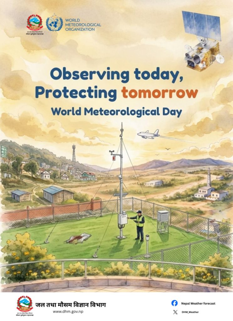 काठमाडौँ। ‘आजको अवलोकन, भोलिको सुरक्षा’ भन्ने नाराका साथ नेपालमा पनि बिबिध कार्यक्रम आयोजना गरी विश्व जल तथा मौसम दिवस मनाइँदै छ । सन् १९५० मा विश्व मौसम विज्ञान सङ्गठनको स्थापना भएको दिनको सम्झनामा सन् १९६१ देखि यो दिवस मनाउन थालिएको हो ।