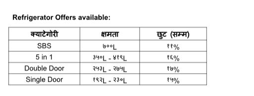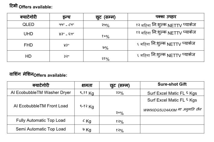 यस क्याम्पेन अन्तर्गत सामसङले टिभी मा २५% सम्मका छुट वाशिंग मेशिनमा २३% सम्मका छुट, र रेफ्रिजरेटरमा १७% सम्मका छुट उपलब्ध गराएको छ।