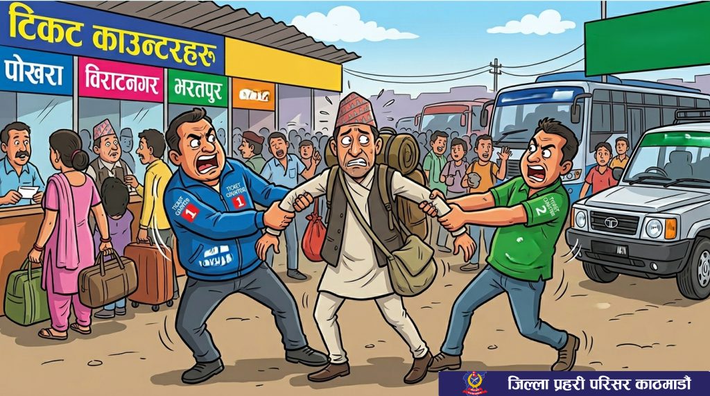 ती स्थानमा सञ्चलित टिकट काउन्टरमा आफूहरूले भनेको सवारी साधनमा यात्रा गर्नुपर्छ भनी सर्वसाधारणलाई जबरजस्ती तान्ने, दुःख हैरानी दिई अभद्र व्यवहार गर्ने व्यक्तिलाई पक्राउ गरिएको परिसरका प्रवक्ता प्रहरी उपरीक्षक पवनकुमार भट्टराईले जानकारी दिए ।