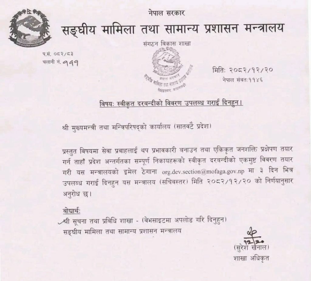 सङ्‍घीय मामिला तथा सामान्य प्रशासन मन्त्रालयले स्थानीय तह र प्रदेश सरकार मातहतका सम्पूर्ण कार्यालयहरुलाई ३ दिनभित्र स्वीकृत दरबन्दीको विवरण उपलब्ध गराउन पत्राचार गरेको छ ।