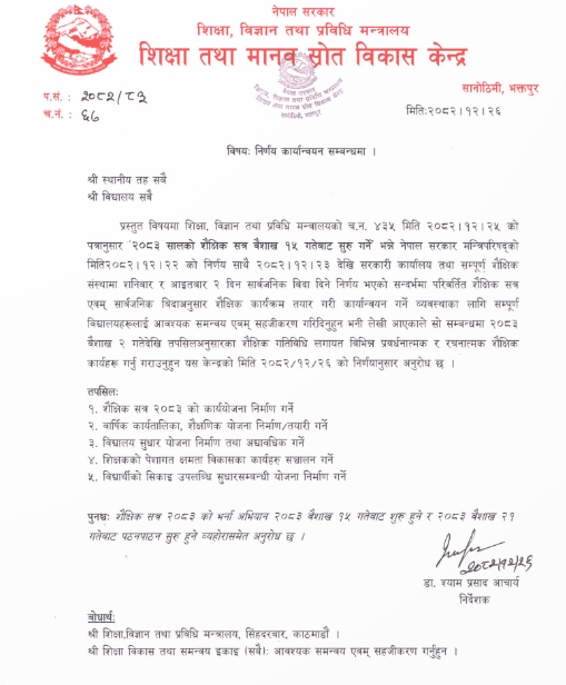 यसअघि १ वैशाखबाट शैक्षिकसत्र सुरु हुने गरेको थियो ।सूचनामा वैशाख २ गतेदेखि प्रवर्धनात्मक र रचनात्मक शैक्षिक कार्य गर्न भनिएको छ ।शैक्षिक संस्थामा शनिबार र आइतबार २ दिन सार्वजनिक बिदा दिने निर्णय रहेको छ ।