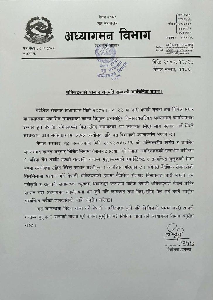 सूचनामा भनिएको छ, ‘वैदेशिक रोजगारीको सिलसिलामा प्रस्थान गर्ने नेपाली श्रमिकहरूको हकमा वैदेशिक रोजगार विभागबाट जारी भएको श्रम स्वीकृति र राहदानीलगायतका न्यूनतम आधारभूत कागजातबाहेक नेपाली श्रमिकहरूले नेपाल बाहिर प्रस्थान गर्दा अध्यागमन कार्यालयमा थप कुनै पनि कागजात तथा बिल/रसिद पेस गर्न नपर्ने बेहोरा सम्बन्धित सबैको जानकारीको लागि अनुरोध गरिन्छ।’