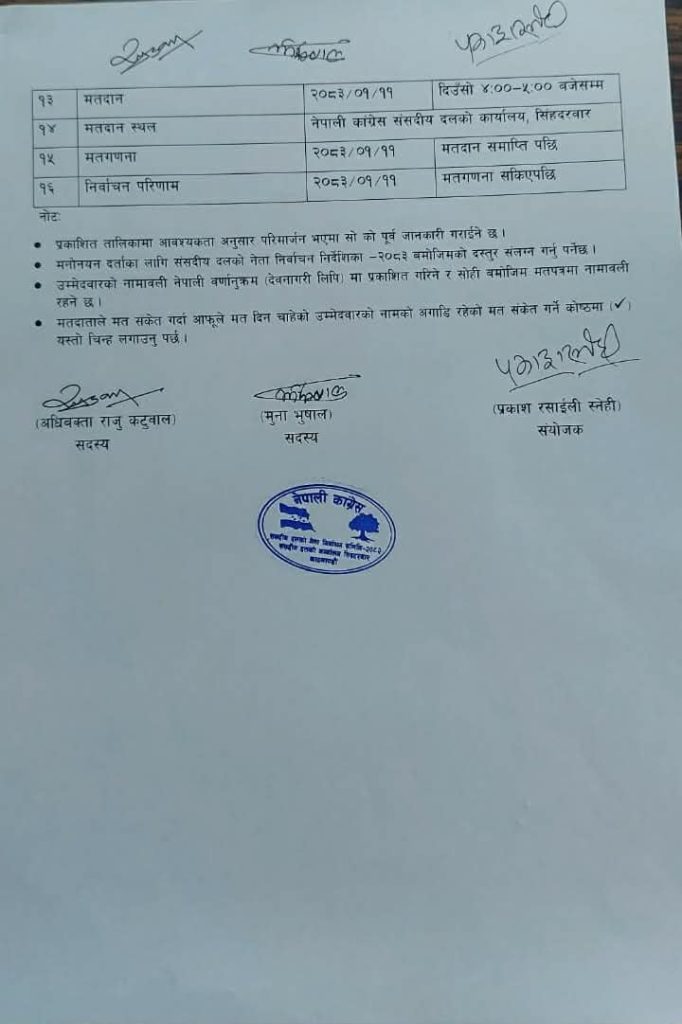 काठमाडौँ– नेपाली कांग्रेसले संसदीय दलको नेता चयनका लागि शुक्रबार निर्वाचन प्रक्रिया अघि बढाउँदै छ। पार्टीले सार्वजनिक गरेको निर्वाचन कार्यतालिका अनुसार उम्मेदवारी दर्ता बिहान ११ देखि १२ बजेसम्म हुनेछ भने मतदान साँझ ५ बजेसम्म सम्पन्न गरिने छ ।