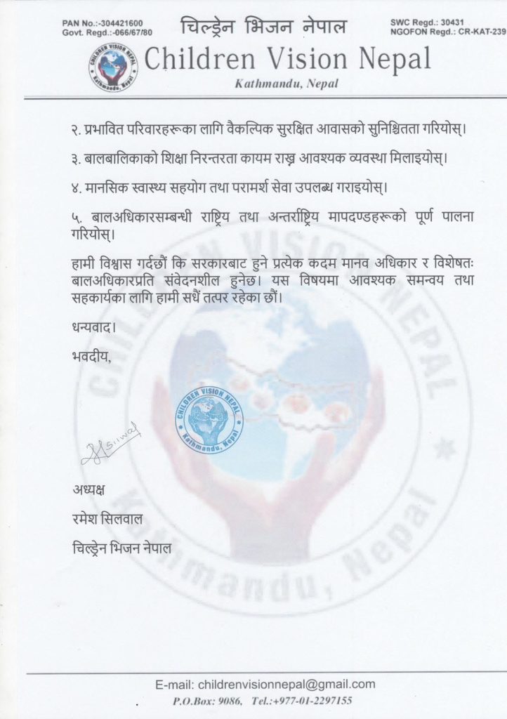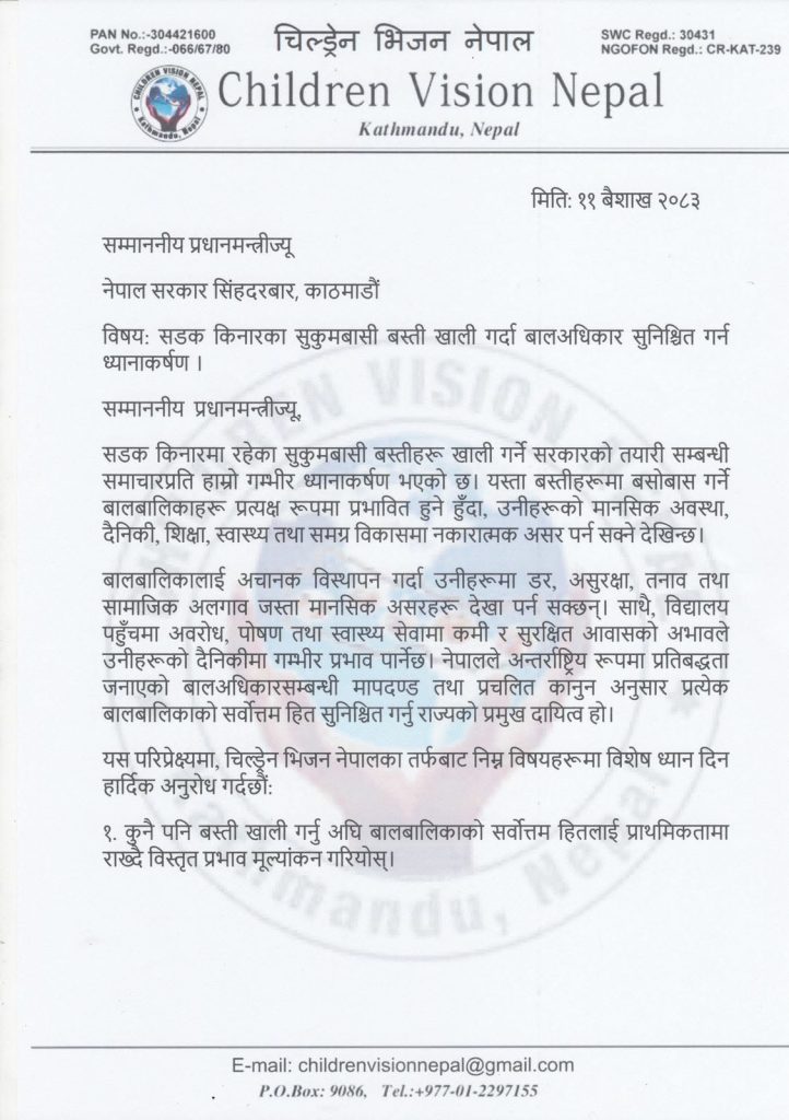 चिल्ड्रेन भिजन नेपालद्वारा सुकुमबासी बस्ती खाली गर्ने क्रममा बालअधिकार सुनिश्चित गर्न सरकारलाई ध्यानाकर्षण