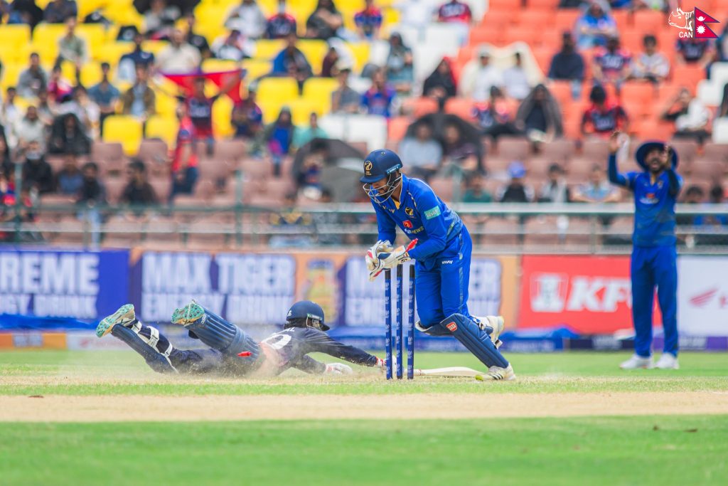 यस्तै, कुशल भुर्तेलले २४, करण केसीले २२, आरिफ शेख र सोमपाल कामीले १५–१५ रन जोड्दा भीम सार्कीले १० रन बनाए। आसिफ शेख ७ तथा रोहित पौडेलले २ रन जोडेर पभेलियन फर्किए।