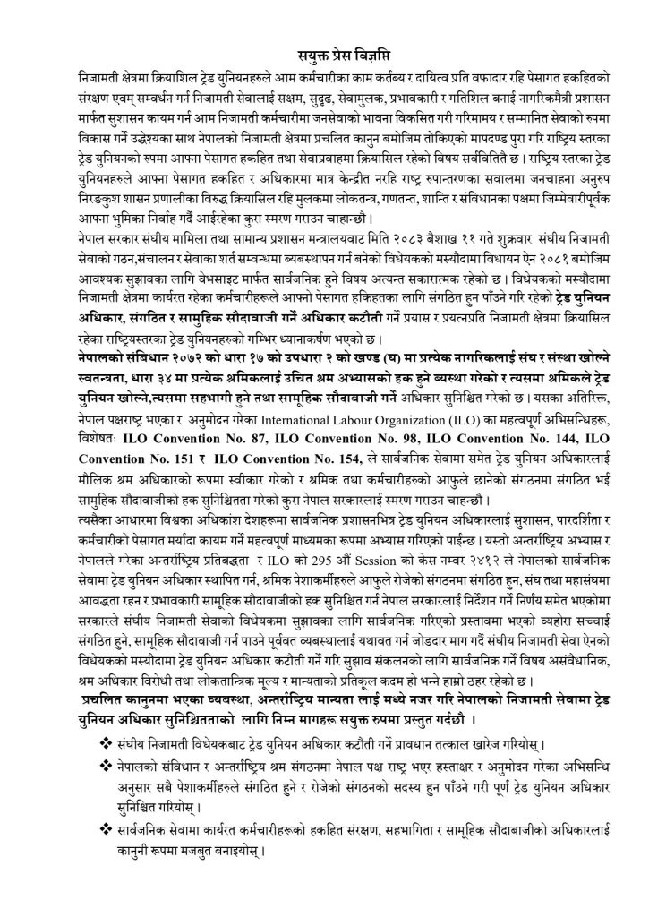 आइतबार संयुक्त प्रेस विज्ञप्ति जारी गर्दै ट्रेड युनियनहरूले कर्मचारीहरूको पेसागत हकहित संरक्षण, प्रभावकारी सेवा प्रवाह र सुशासन प्रवर्द्धनमा आफ्नो भूमिका महत्वपूर्ण रहेको उल्लेख गरेका छन्। उनीहरूले लोकतन्त्र, गणतन्त्र, शान्ति र संविधानको पक्षमा निरन्तर जिम्मेवारीपूर्वक भूमिका निर्वाह गर्दै आएको पनि स्मरण गराएका छन्।