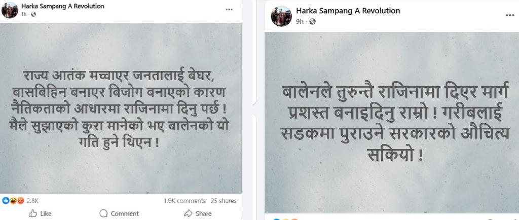 बुधबार उनले लेखेका छन् , ‘बालेनले तुरुन्तै राजिनामा दिएर मार्ग प्रशस्त बनाइदिनु राम्रो १ गरीबलाई सडकमा पुराउने सरकारको औचित्य सकियो ।’