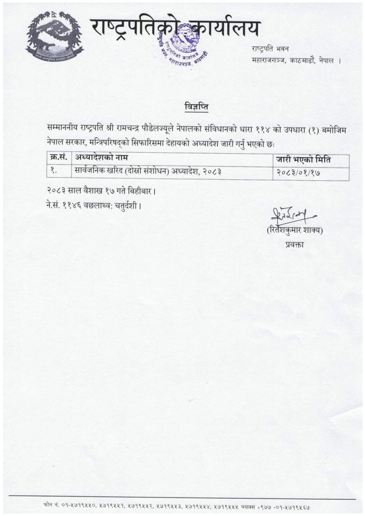 नेपालको संविधानको धारा ११४ को उपधारा (१) बमोजिम नेपाल सरकार, मन्त्रिपरिषद्को सिफारिसमा राष्ट्रपति पौडेलले सार्वजनिक खरिद अध्यादेश जारी गरेको राष्ट्रपतिको कार्यालयका प्रवक्ता रितेशकुमार शाक्यले जानकारी दिए।