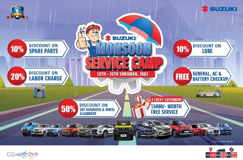 सुजुकीको ‘मनसुन सर्भिस क्याम्प’ साउन १८ देखि, छुट र उपहारको अवसर
