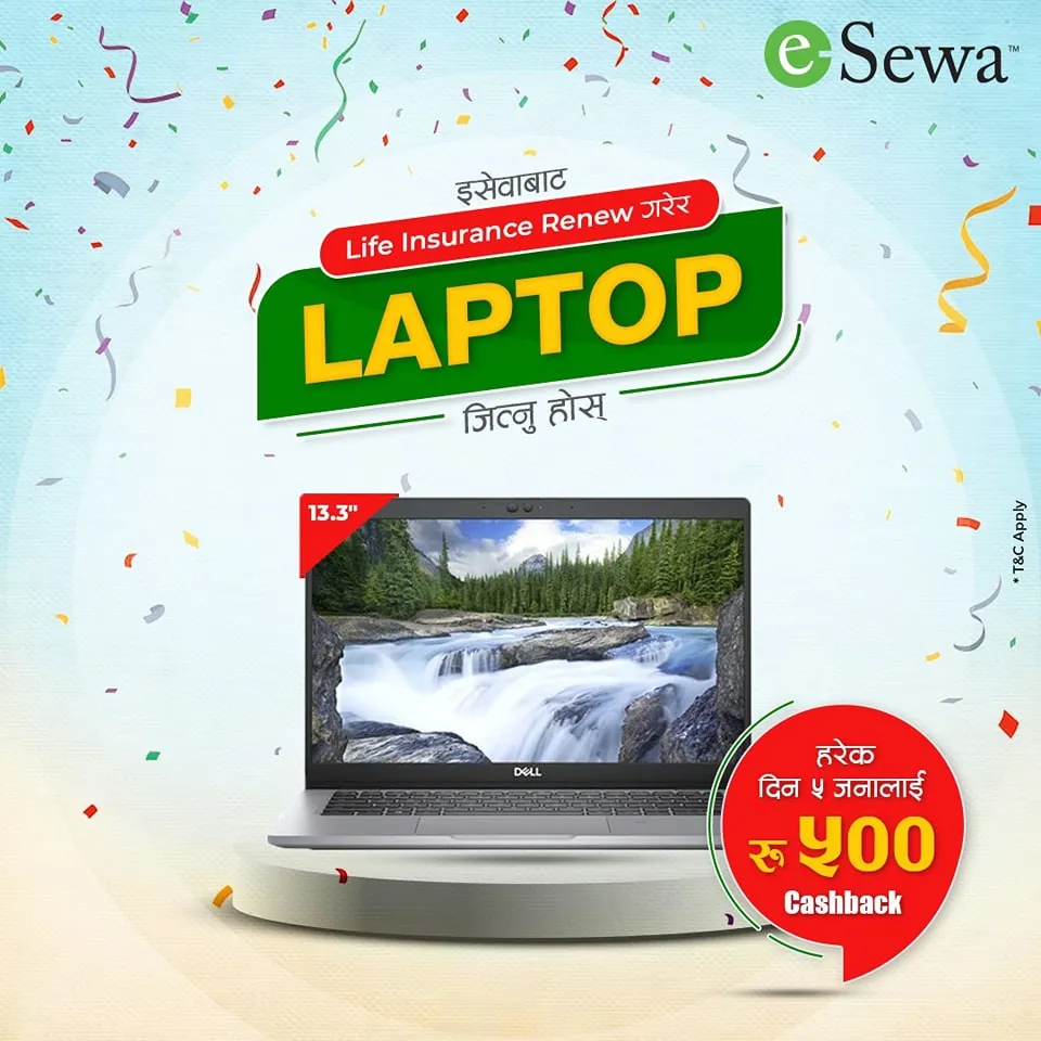 ईसेवाबाट बीमा शुल्क भुक्तानी तथा नवीकरण गर्दा ल्यापटप र ५०० क्यासब्याक