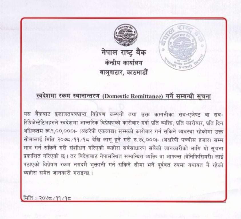 आन्तरिक विप्रेषणको सीमा घट्यो, प्रतिदिन २५ हजार मात्र पठाउन पाइने