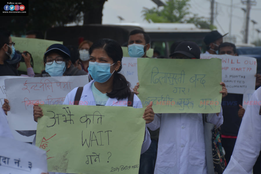 नेपालमा इन्टर्नसीप गर्न पाउनुपर्ने माग राख्दै चीनबाट फर्केका विद्यार्थीको प्रदर्शन (फोटोफिचर)