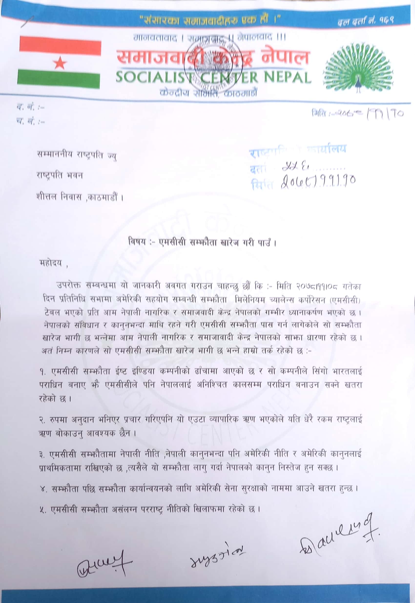 एमसीसी खारेज गर्न माग गर्दै राष्ट्रपतिलाई निवेदन